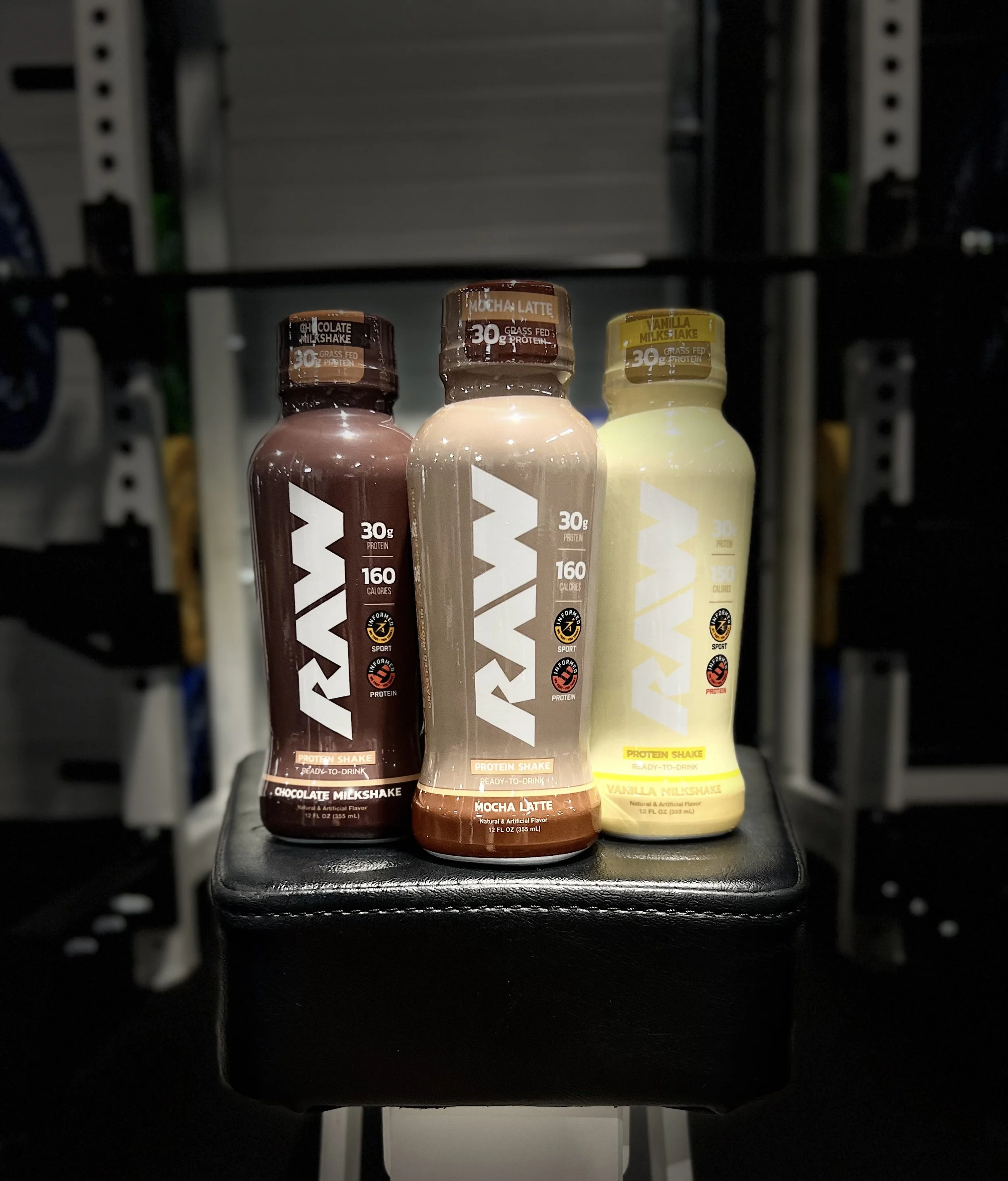 Our Ready To Drink protein shakes from Raw Nutrition have 30g of protein and 150 calories each. Easy to grab for a pre or post lift drink.